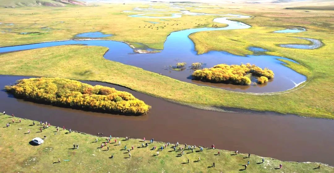 徒步的起点,设在莫日格勒河畔,这里以“曲”闻名于天下,假如从空中俯瞰,河道狭窄蜿蜒,像一条看不见终点的蓝色绸带铺陈在茵茵草原上。