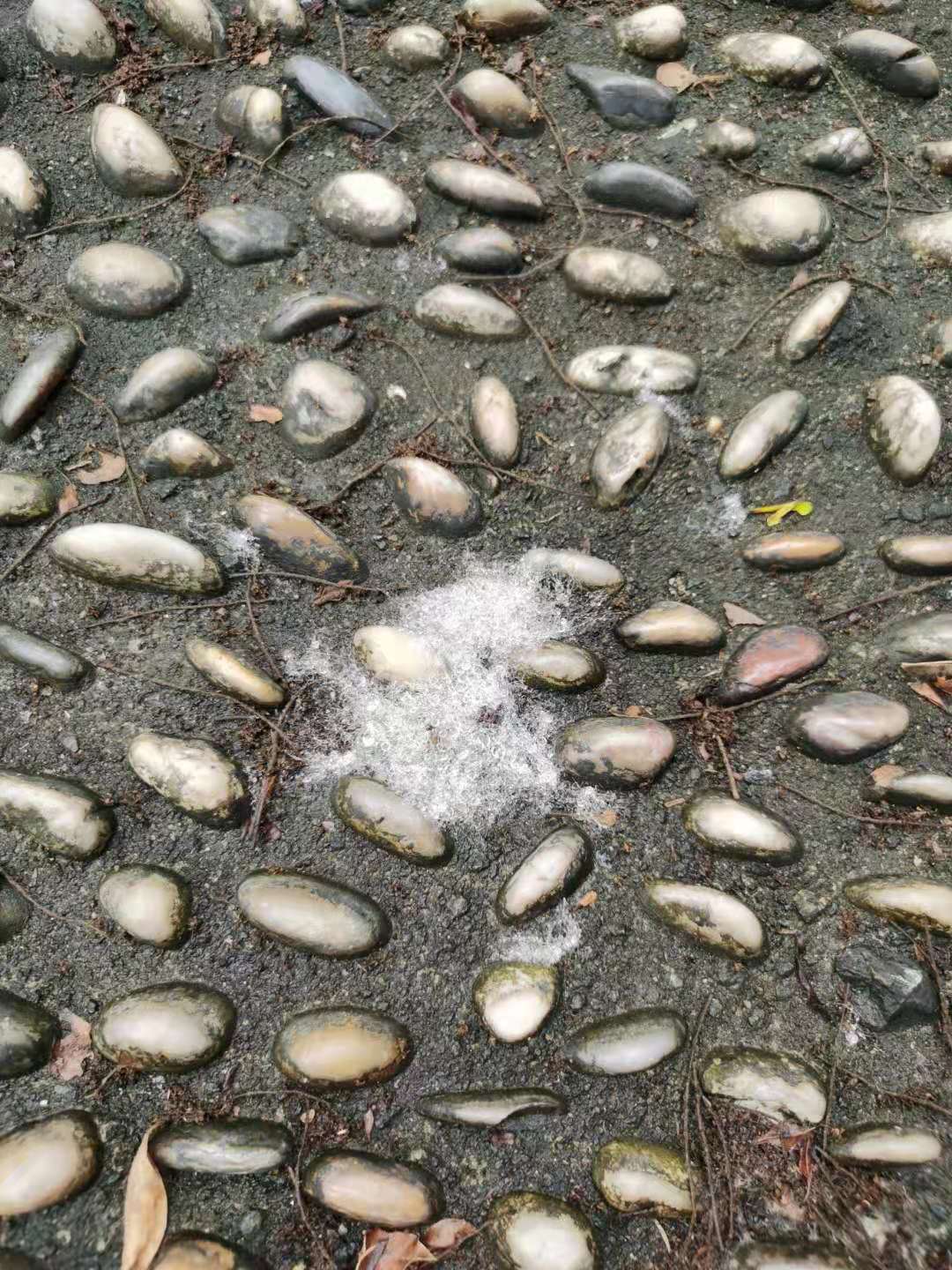 早上在小区里散步,看到石子路上一堆一堆的“雪”,不禁诧异,仔细看,原来是美丽异木棉的棉花,被雨水打湿之后,像极了北方的残雪。