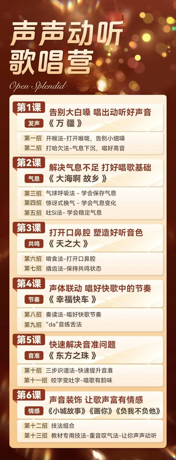 🔥歌唱家亲自直播,带你全方位提升唱功+唱商,唱得轻松高效; 🔥1V1伴学+练习打卡,有任何问题直接问助教团队,让你少走弯路放心学; 🔥独家歌曲精讲+拆解动作要点+全程带练,0基础也能快速掌握唱歌精髓; 🔥学完后,让唱歌成为你的魅力名片