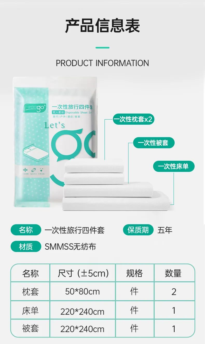 Freego设计的旅行用品主打的就是一个便捷随行,一次性旅行四件套也不例外。尺寸设计上有很好的包容性,无论是单人床还是双人床均可适用。