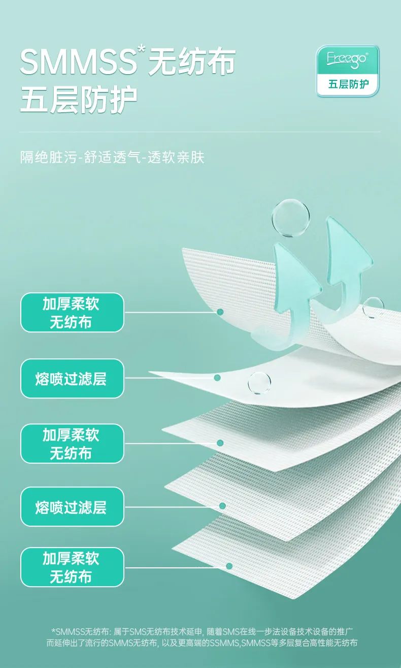 一次性四件套除了解决最基本的卫生问题,有效隔水隔脏之外,材质触感也是决定产品好感的关键。Freego的研发团队就针对材质问题做了不少功课。目前市面上的同类产品多为普通无纺布材质或者是SMS无纺布材质,为了更好的体验感,Freego选择了升级型面料SMMSS无纺布面料。