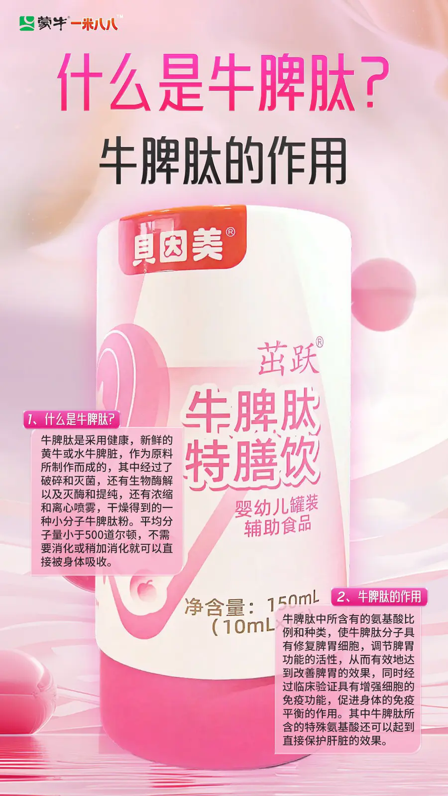 贝因美茁跃牛脾肽优选黄牛、水牛脾脏为原料,经过提取、灭菌、灭酶、离心喷雾干燥等一些列操作,最后成为小分子牛脾肽粉,更易人体吸收,调理孩子脾胃,吸收好,营养好,从而帮助孩子成长发育