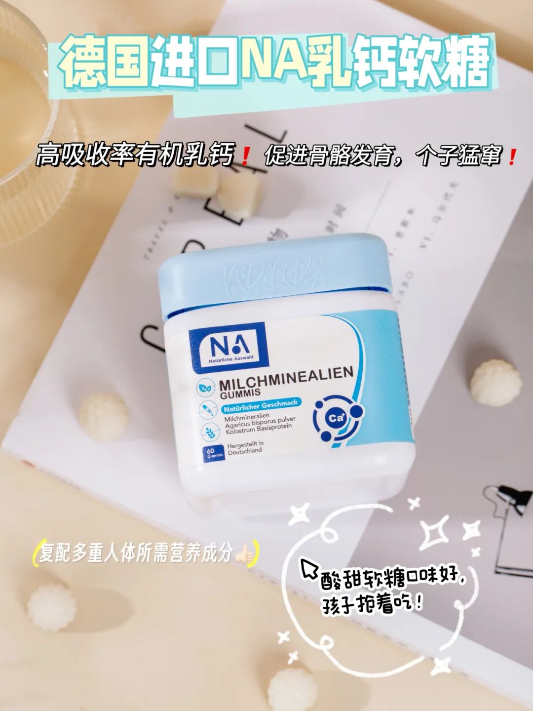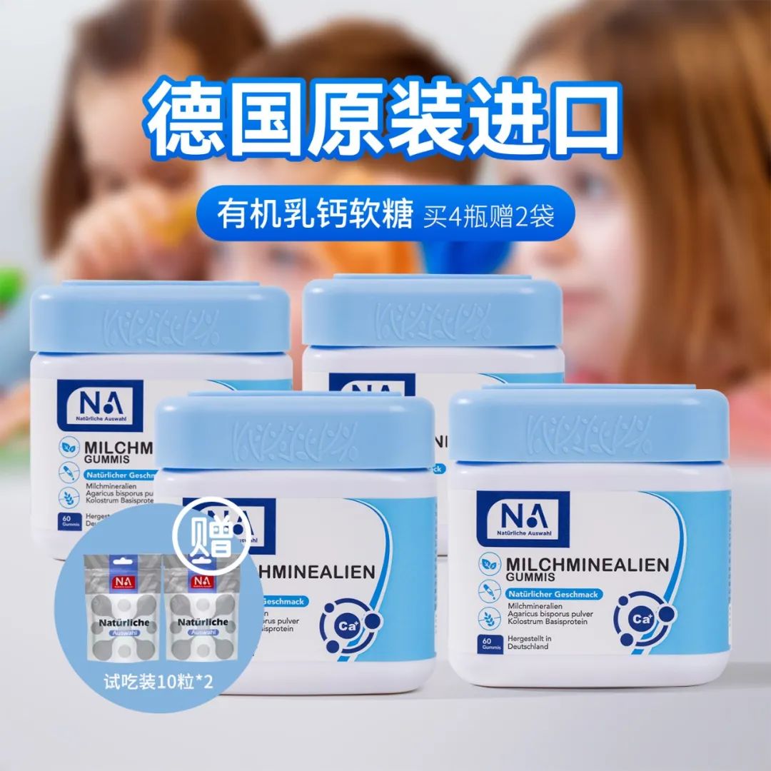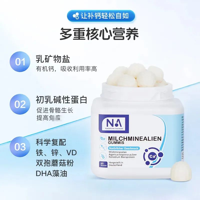 这瓶由德国品牌NA(NaturlicheAuswahl自然之选)出品,德国汉诺威大学医学院联合研发,欧美商超同步在售的NA自然之选乳矿物盐软糖(又叫乳钙软糖),重磅来袭!