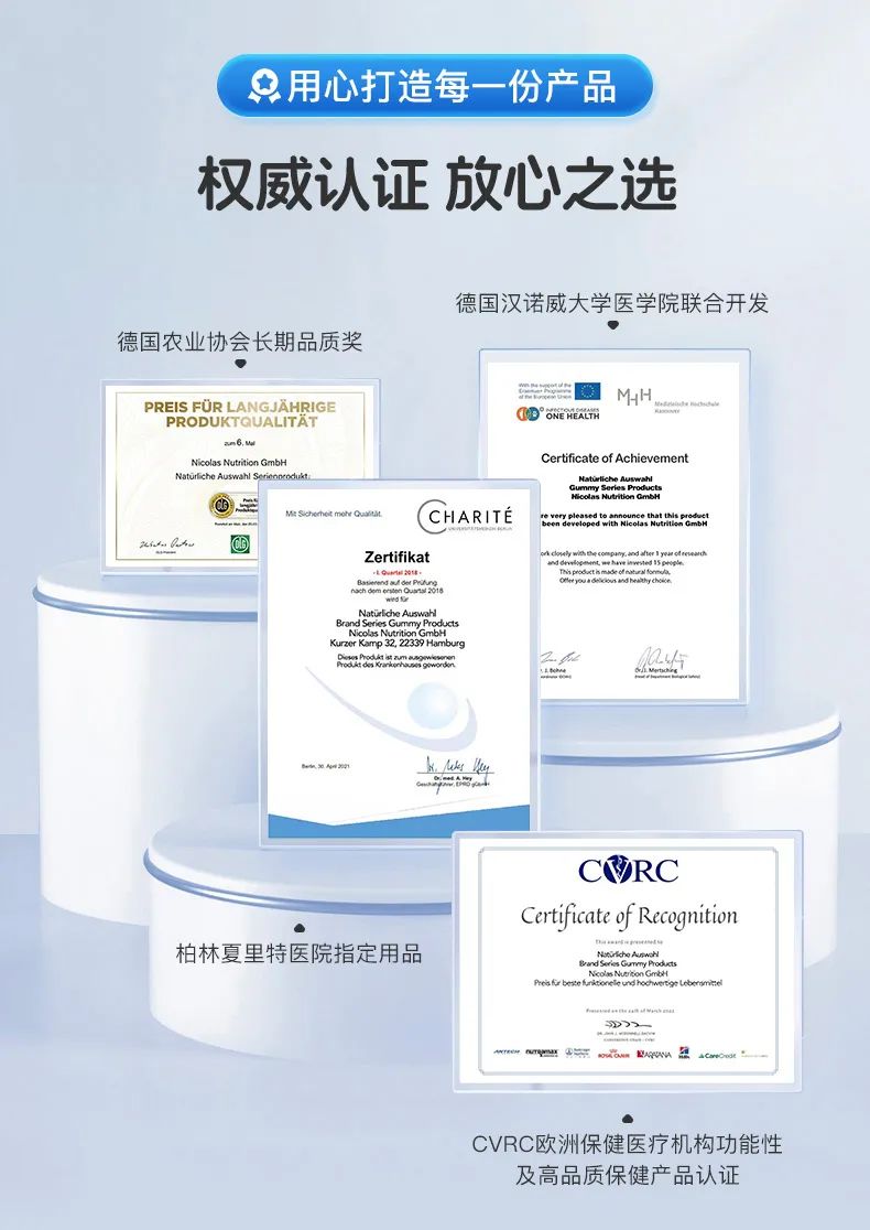 拥有CVRC欧洲保健医疗机构功能性及高品质保健产品认证,还曾获得德国农业协会长期品质奖,更是柏林夏里特医院指定用品!