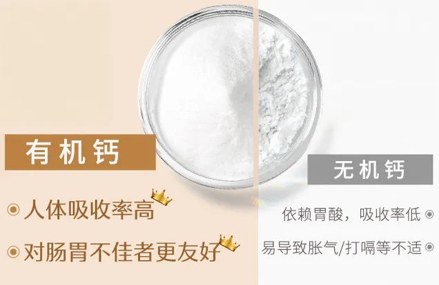 无机钙依赖胃酸吸收,对肠胃有刺激,虽然获得成本低,但吸收率也低,易导致胀气打嗝等肠胃不适。