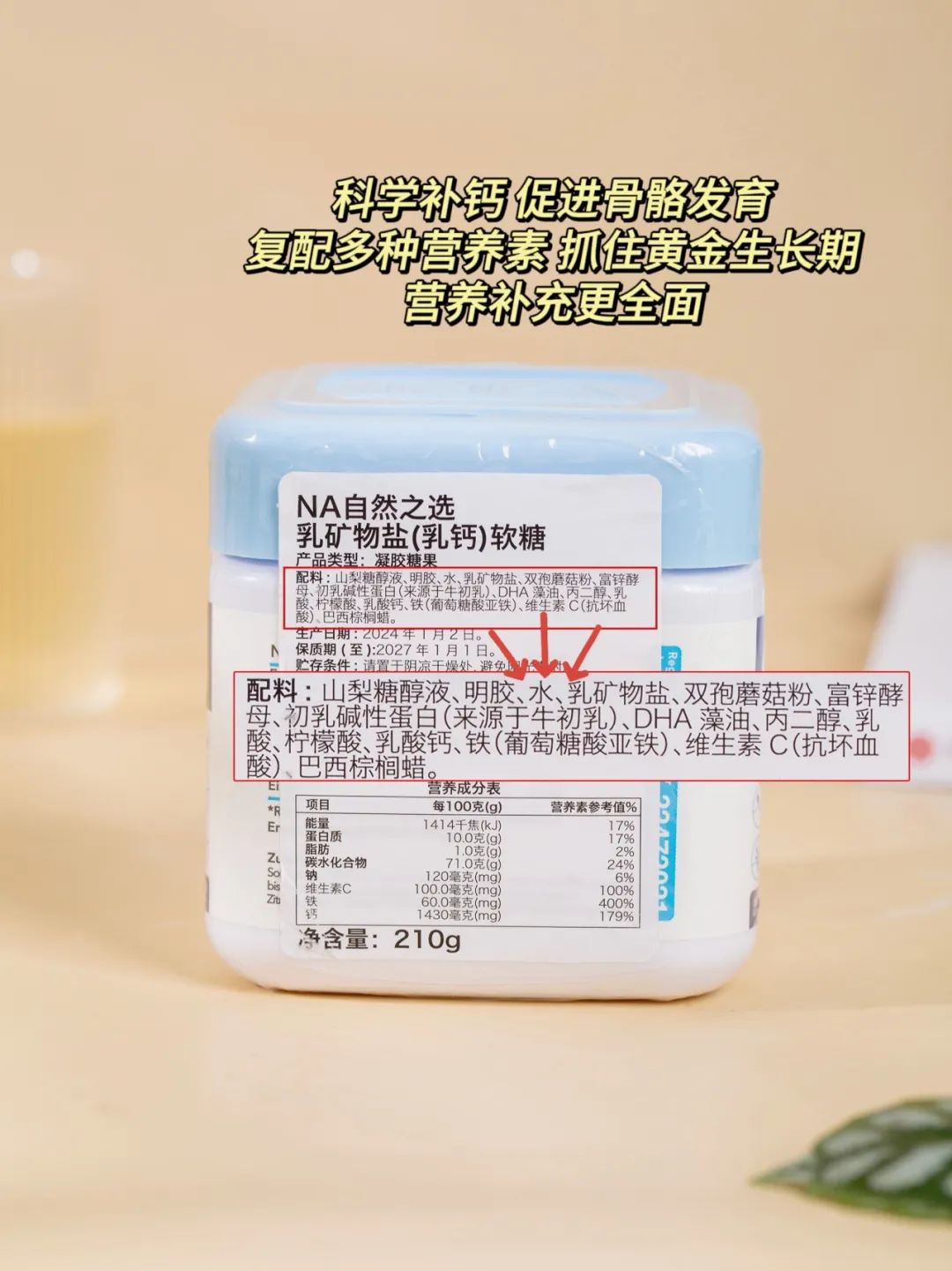 NA乳钙软糖,臻选有机钙乳矿物盐作为核心成分,复配初乳碱性蛋白和双孢蘑菇粉;另外还添加DHA藻油、葡萄糖酸亚铁、富锌酵母、维C等,样样都是顶呱呱的珍贵营养素,这都是让孩子长高高长壮壮的关键!