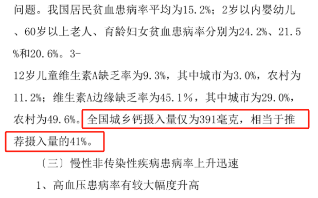 据《2022年我国居民营养与健康现状的调查分析报告》数据显示,全国城乡钙摄入量仅为391毫克,相当于推荐摄入量的41%!