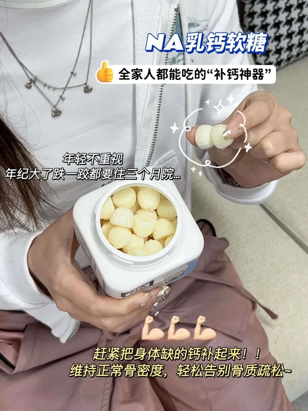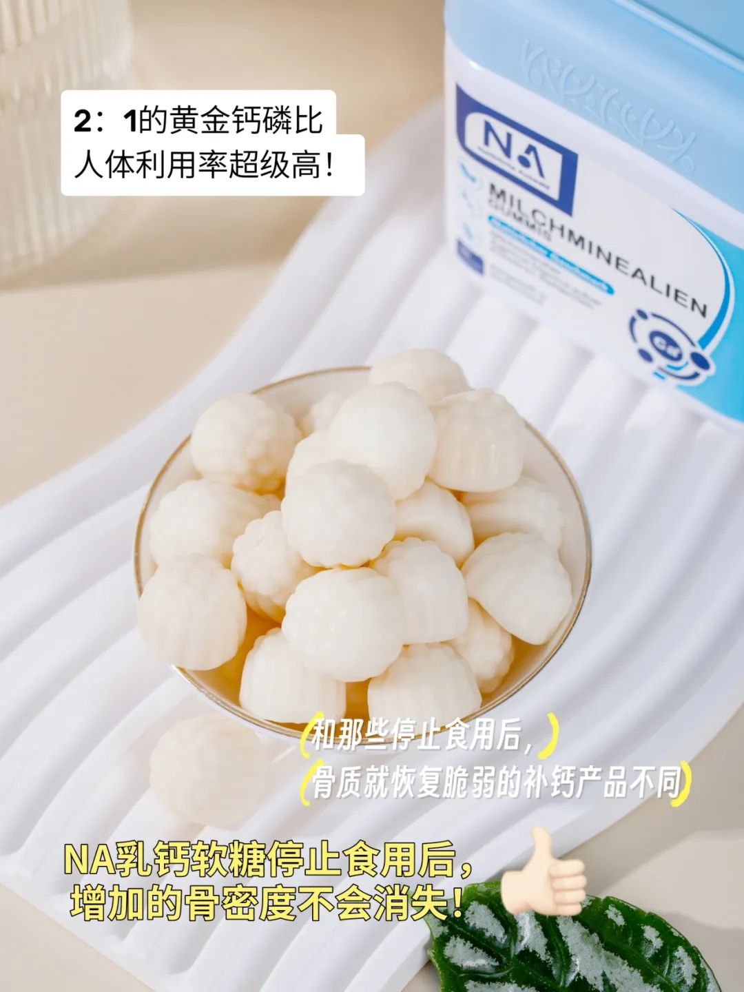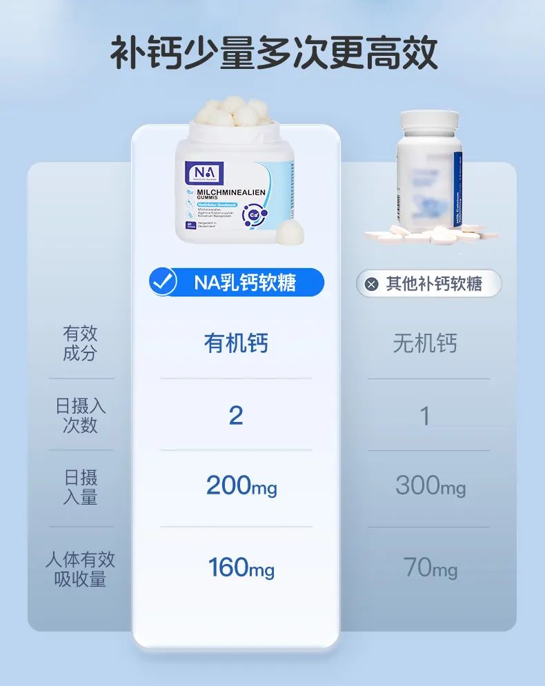 所以NA乳钙软糖,可以早2粒,睡前2粒,轻松满足日常需求~