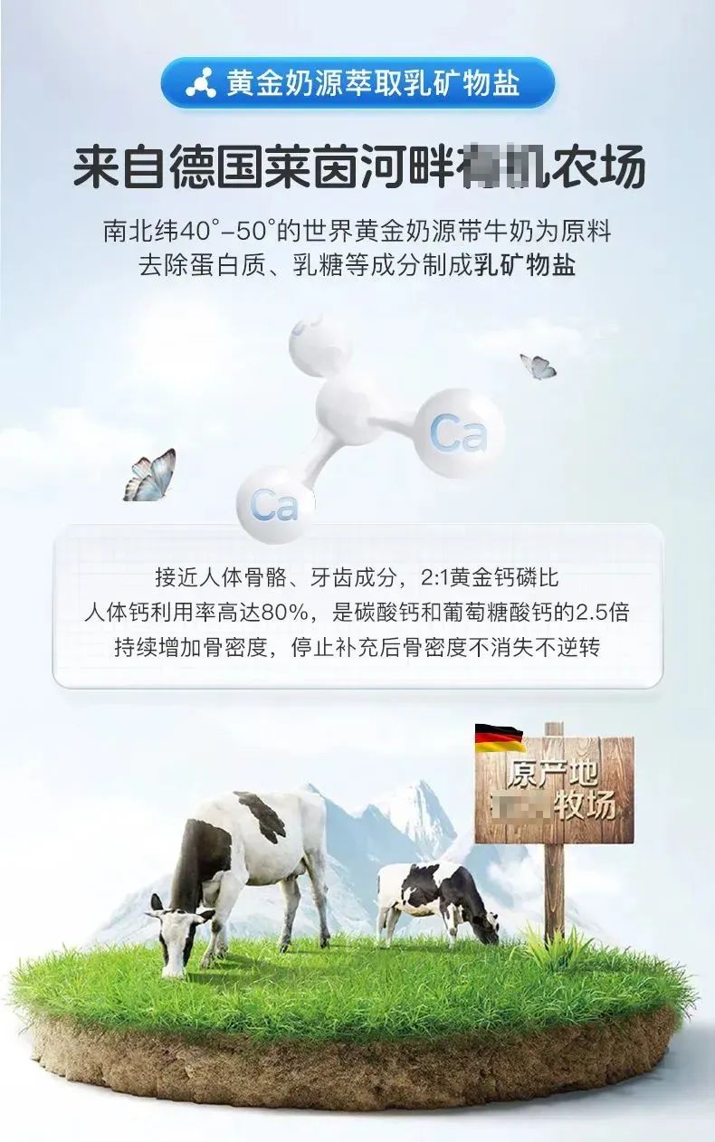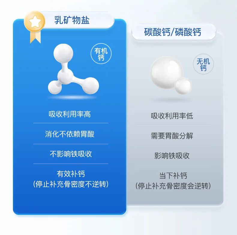 乳矿物盐也叫乳钙,属于优质有机钙,不仅含有丰富的钙之外,还含有磷、镁、乳糖和蛋白质等,能够为人体提供平衡的营养素,且不依赖胃酸,对肠胃功能弱的人群非常友好!