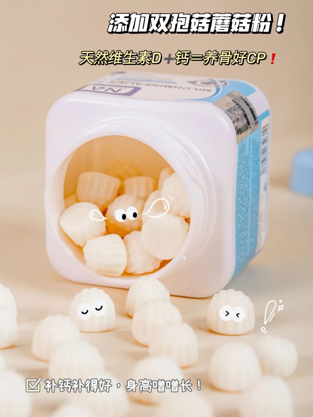 钙的吸收离不了维生素D,为了促进钙的吸收利用,NA乳钙软糖加入双孢蘑菇粉来提供维D,把钙牢牢锁住,提升骨骼发育!