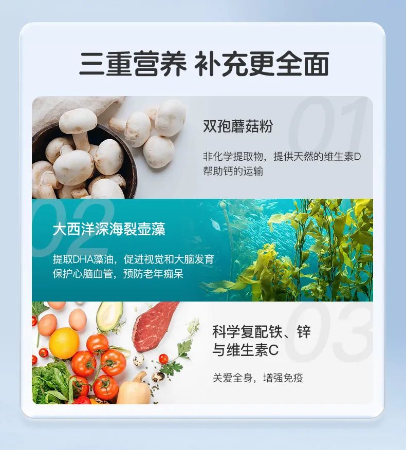 并且,为了多方位守护我们的身体健康,NA还科学复配了DHA藻油、葡萄糖酸亚铁、富锌酵母、维生素C等多种营养成分,促进身体健康发育!