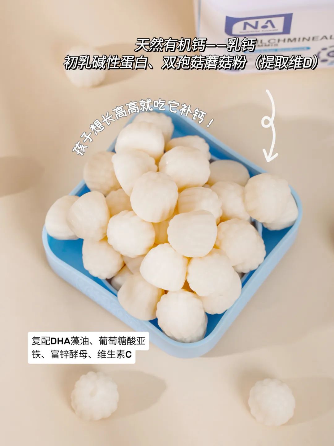 但因为原料昂贵,很多产品不舍添加,NA不惜成本,将它加入乳钙软糖中,只为给孩子们一个好的补钙体验!