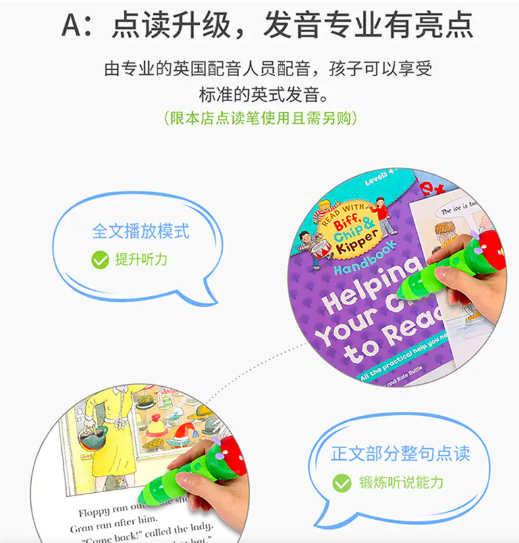 任何一门语言的学习离不开听说读写,光看可不行,配合毛毛虫点读笔Wi-Fi版的牛津树更强大了,点读笔的标准英式发音,不用担心口音问题,整句点读加场景对话跟读,更有惊喜音效,简直是在听绘本剧,让孩子们融入场景中的同时,也做到了有效输入,输出标准。