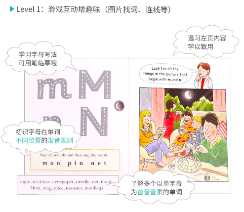 分级读物的级别的设置,由Level 1 拼读-Level2词汇句子结构-Level3 正式阅读,由三四个词语组成简单句到第三级逐渐增加难度,用颜色区分级别,一目了然,真的是方便父母。
