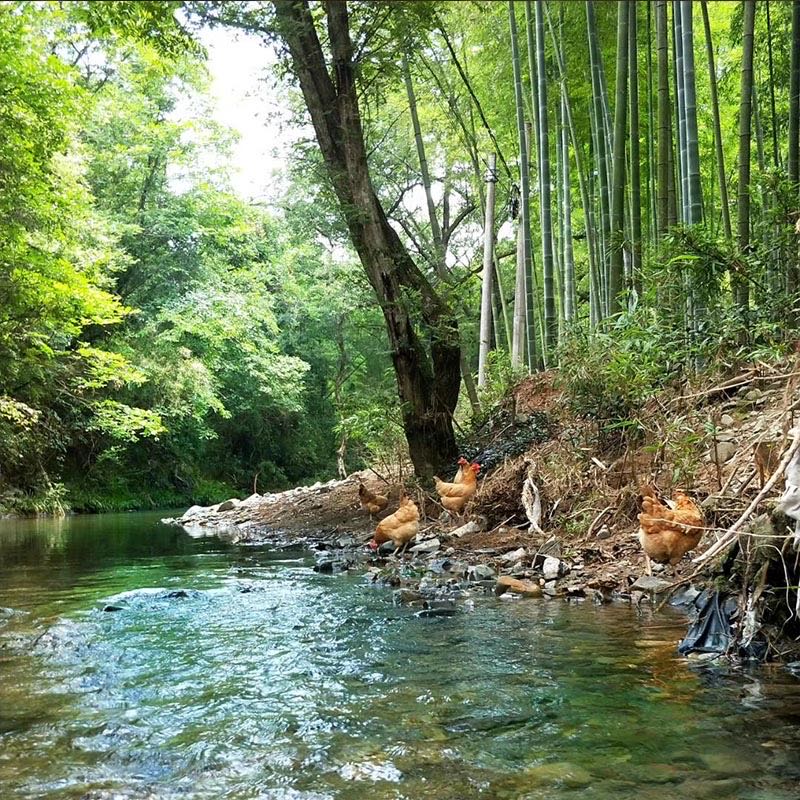 鸡苗不杂交,成型后上山散养,啄小虫细草,喝山泉水,吃玉米南瓜原粮。