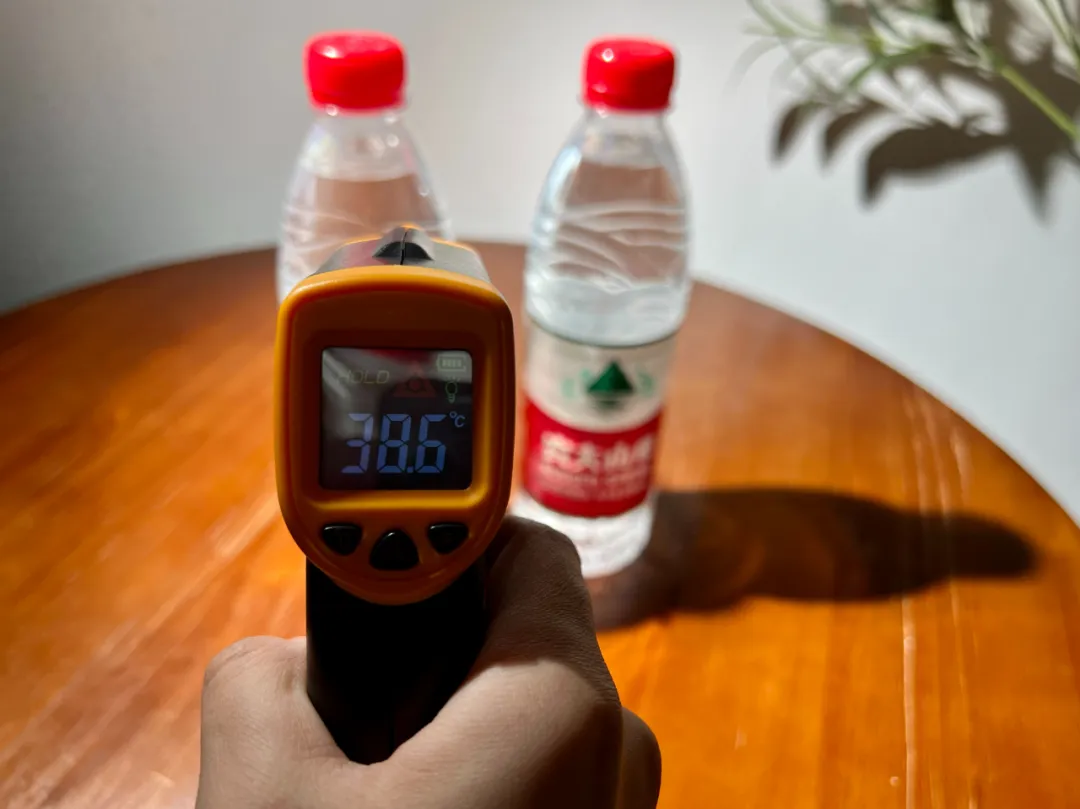 准备2瓶38.6℃左右的水,把这2瓶水分别用黑金沸腾裤和普通裤子包裹起来,放到冰箱的冷冻室。