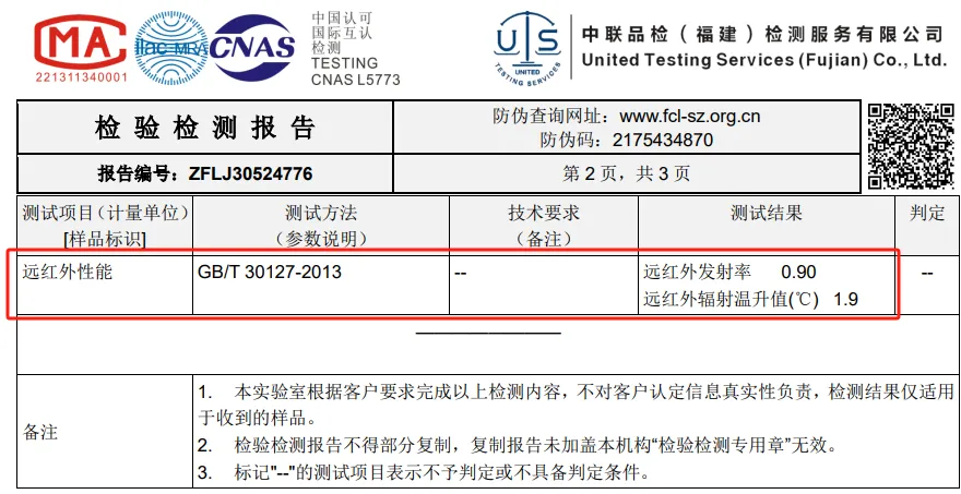 咱们再来看看质检报告中显示:远红外性能是真实存在效果的(升温)!