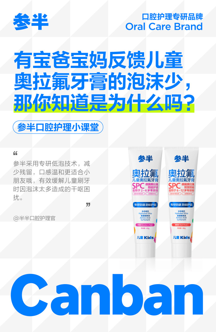 参半奥拉氟儿童牙膏采用专研低泡技术,减少残留,口感温和更适合小朋友哦,有效缓解儿童刷牙时因泡沫太多造成的干呕困扰!
