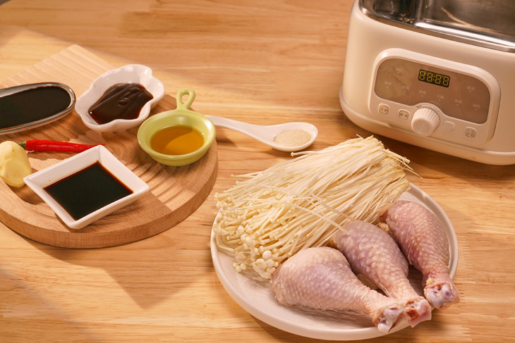 4、取一干净的碗,将金针菇铺底,然后将腌制好的鸡腿 和腌汁一起放入。