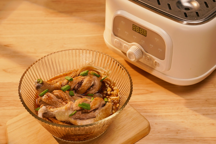 5、墩墩锅中加入适量清水,放上蒸架,把碗放上蒸架选 择“速蒸功能”蒸20-30分钟即可(取决于鸡腿的大小)。