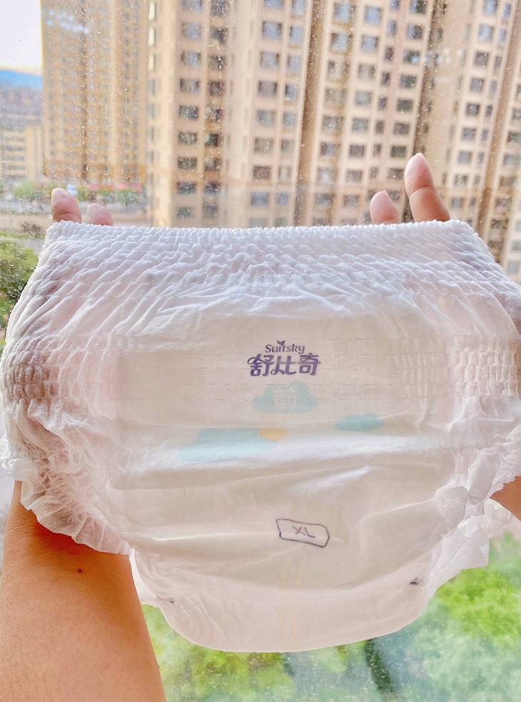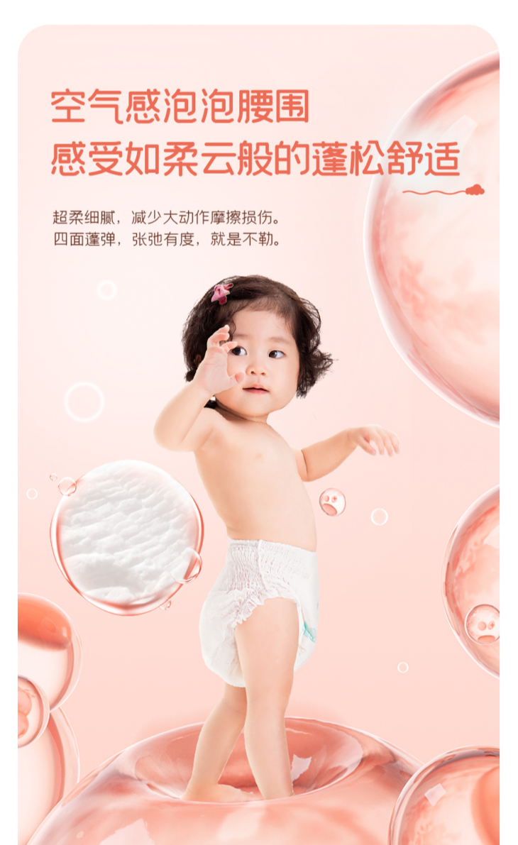 除了天然维E的保湿和抑菌保护,我和家人都非常喜欢舒比奇维E拉拉裤的空气感泡泡腰围设计。