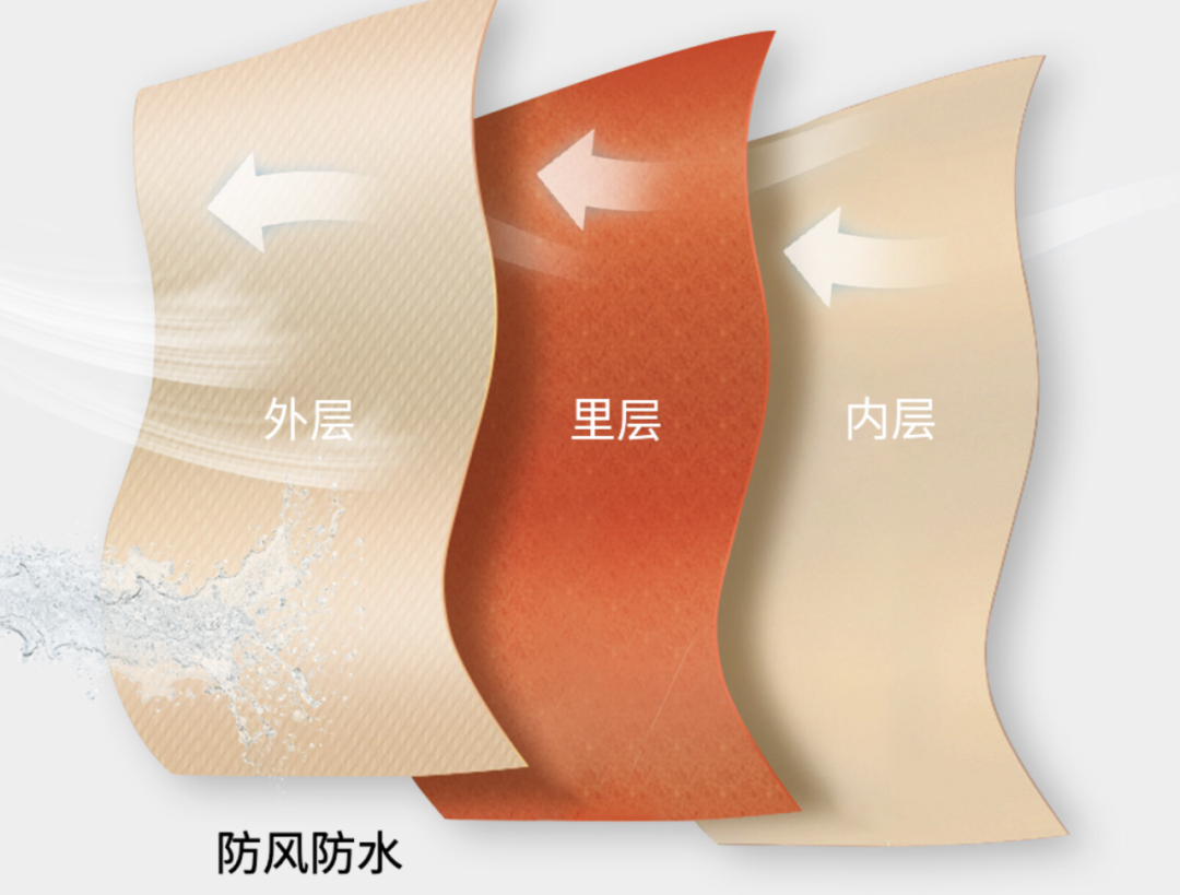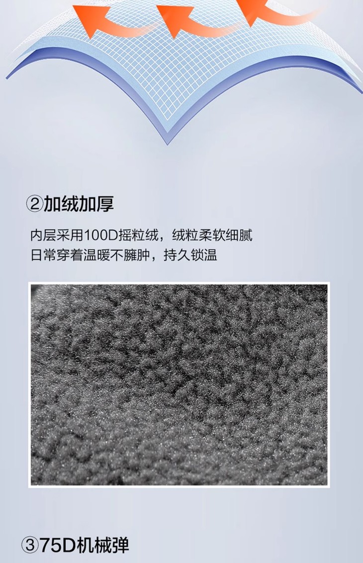 外层75D机械弹,夹层高弹高透膜,内层100D摇粒绒,具有防风、防水、透气、保暖等特点。