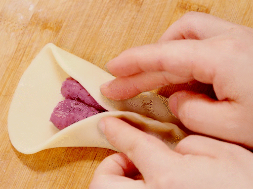 9.擀面杖擀成长方形的片状,将馅料挤入面团中间