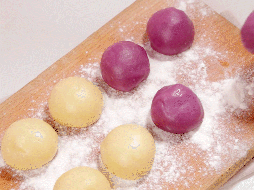 8.分割40g/个麻薯团,揉圆,在案板上撒手粉防沾