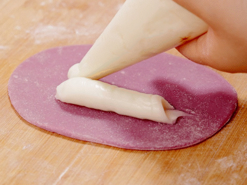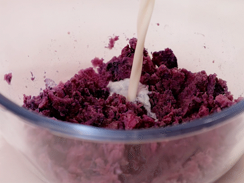 6.紫薯馅料:紫薯切块,蒸制20分钟,加入白砂糖,牛奶按压成泥,装入裱花袋备用