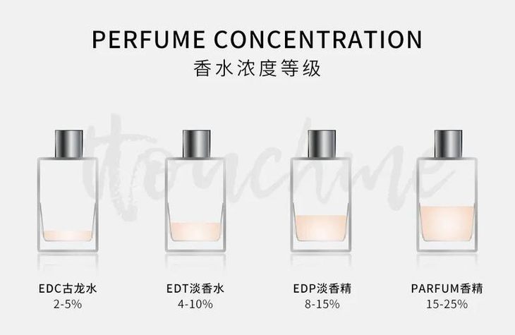 香水浓度主要有四种,古龙水、淡香水,淡香精和香精。一般来说,浓度越高,所需的用量越少。