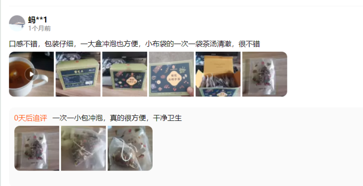 打开包装是单独的茶包,用料也很足。热水冲泡茶包,慢慢可以闻到茶汤淡淡的香味,茶色金黄清冽,入口之后好像有花香,工作时看书时喝上一本,很舒适惬意让人更平静,微涩的决明子也让人神清气爽