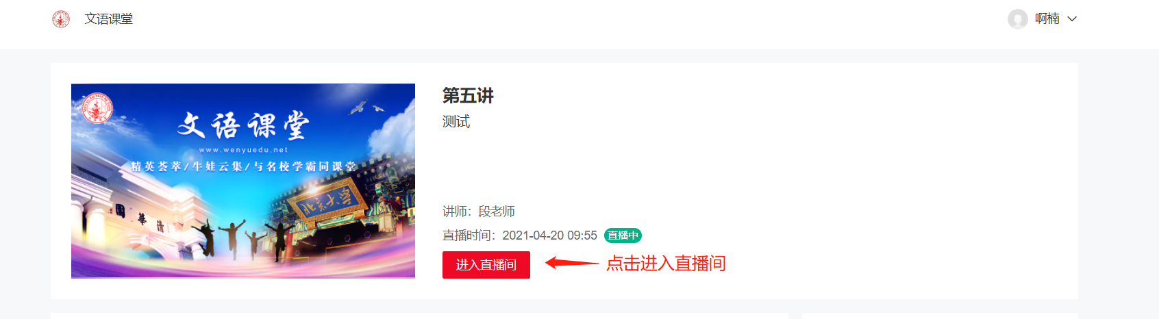 1、点击直播详情页链接输入学号+姓名进行测试。