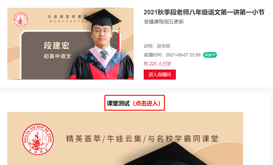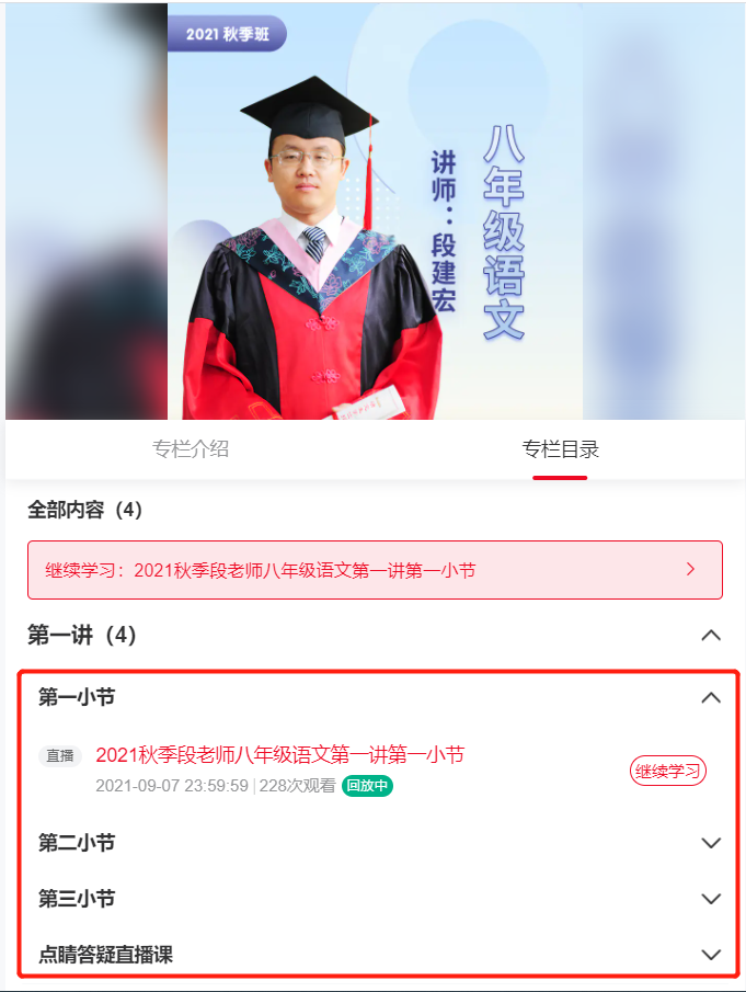 秋季初中每一讲分为四小节,前三节为录播课,第四小节为点睛直播课。