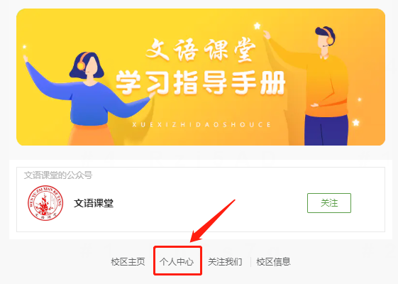 1、复制网址在浏览器中打开,点击个人中心。(kecheng.wenyuedu.net)