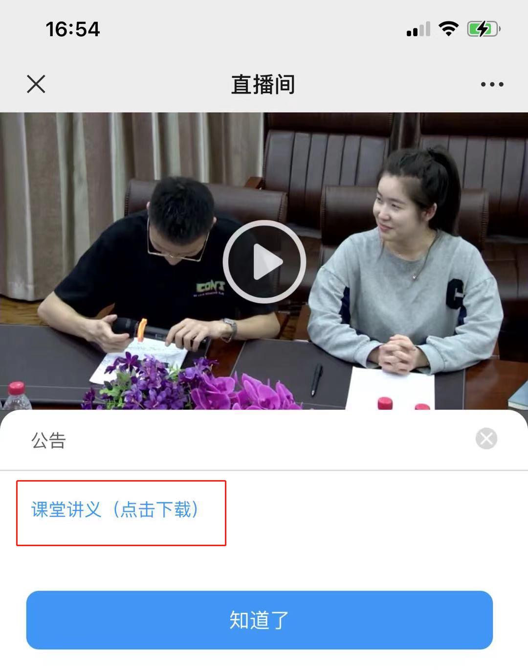 1、第一次进入直播间会直接弹出公告栏,点击蓝色字体下载讲义即可。