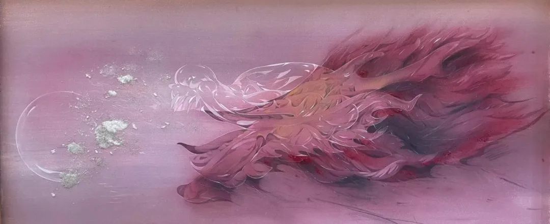 《瑞》系列,可解作祥瑞、瑞兽,和古代用作祭祀的玉器信物。画作连贯东方文化中的各种符号代表,如画中的灵兽形象,浮现东方智慧中龙的图腾。姜淼屏气凝神建筑的世界中散发出一种不可侵犯的气场,铭刻着远古留下的智慧和思想,亦流露出一种安然、随其自然的气息,祈福和平,用她的艺术唤醒内在力量。