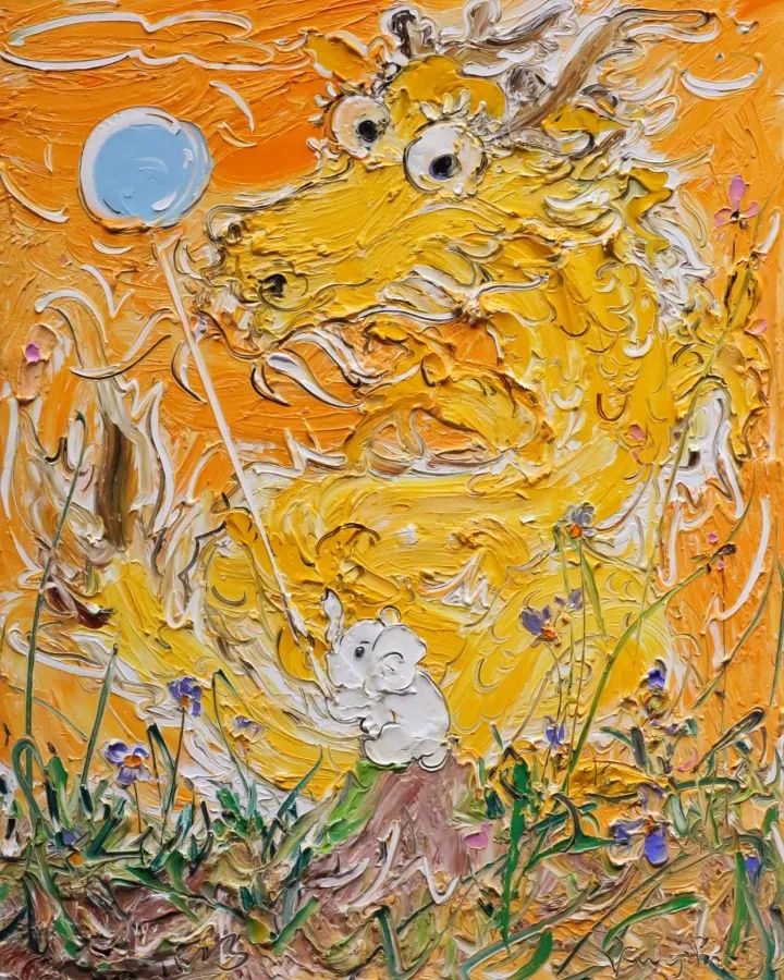 这个作品的名字叫“玉兔逢龙”, 毛茸茸可爱弱小的兔子与庞大威武的龙年的衔接总让人觉得是个很有意思的对比。有一个著名的民间故事叫做 《玉免逢龙》,讲述了免子与龙的交流和友谊。在这个故事中,免子借助自己的智慧和机智,帮助龙实现了自己的目标。无论强大与弱小都有自身的优势。希望借着这幅作品祝大家在即将到来的龙年实现自己的愿望,但有所愿兴盛安康。
