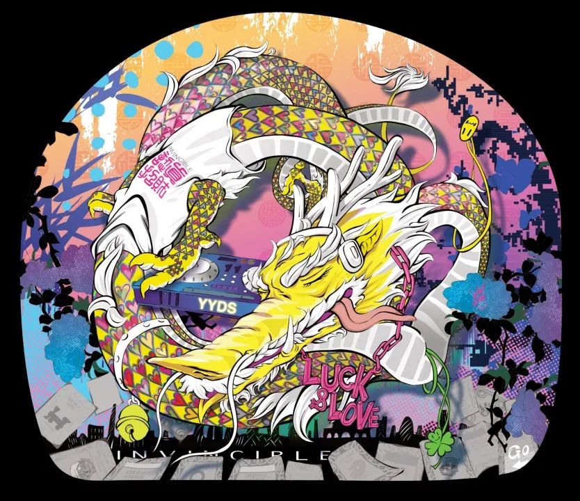 在2024年,时代和世界都在飞速发展“龙”是不是也可以享受当下年轻人的生活? 是不是也会喜欢流行音乐,甚至创作自己喜欢的音乐? 国潮艺术家歪歪,就为观众描绘着了一只这样的祥瑞神龙: 降临人间,全身布满的潮流颜色,鳞片由爱心组成,穿着年轻人常穿的帽衫身上挂着不同颜色的配饰,头上戴着监听耳机:龙爪操作着DJ音乐台,闭眼,全神贯注的投入到自已正在表演的音乐中。这是龙作为瑞兽参与当代年轻人生活的状态是属于2024年的“瑞兽”一它是属于经典的,更是属于时代的,是与时俱进的祥瑞象征!