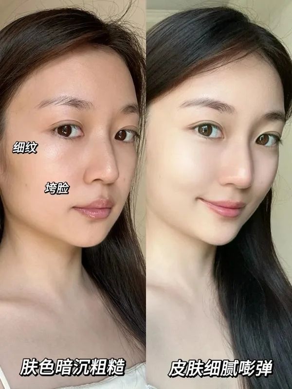 用完之后,摸摸自己的脸,那种水润Q弹的触感,就像刚剥壳的鸡蛋一样嫩滑,肌肤的粗糙感一扫而空,细纹像是被“熨平”了,整个脸变得紧致又饱满,仿佛给肌肤注入了满满的元气。