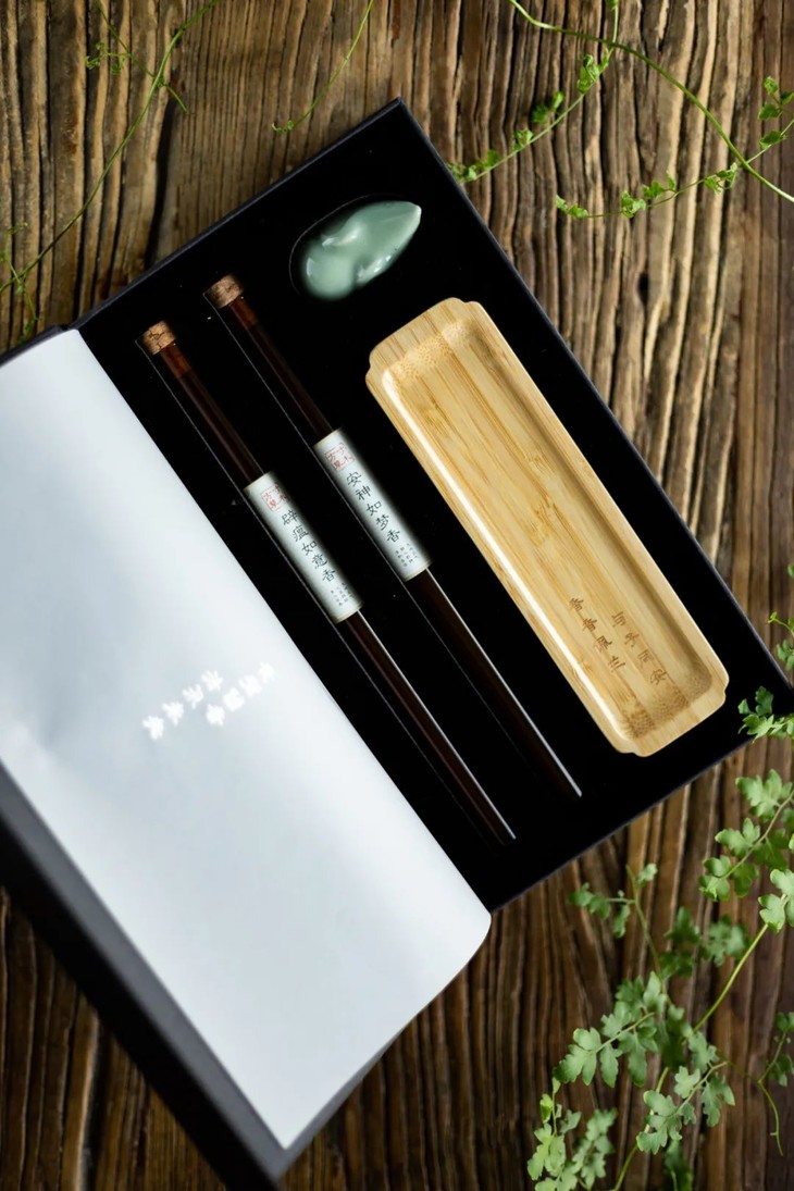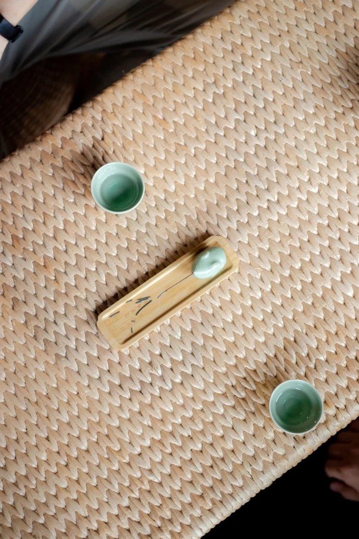 我们还在礼盒中配置了一个香承,一枚简静的竹片。竹意清雅,与青瓷、线香三者意趣相投,香灰落下,犹如古人留在竹片上的墨迹。