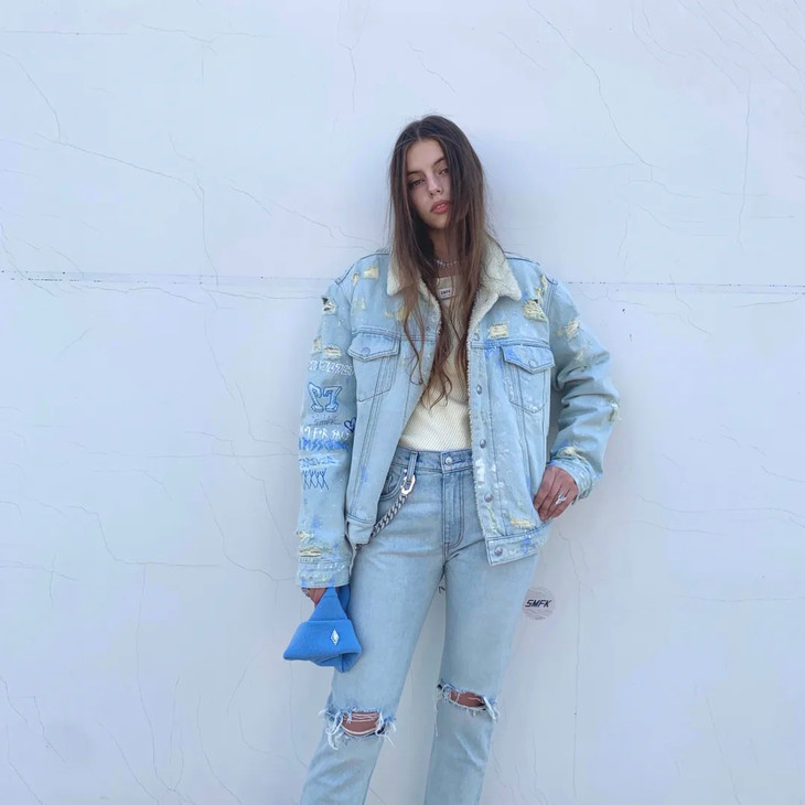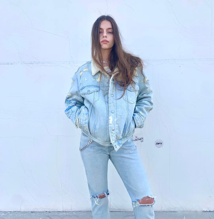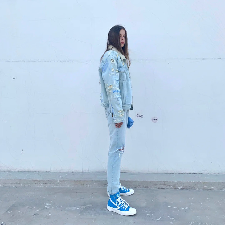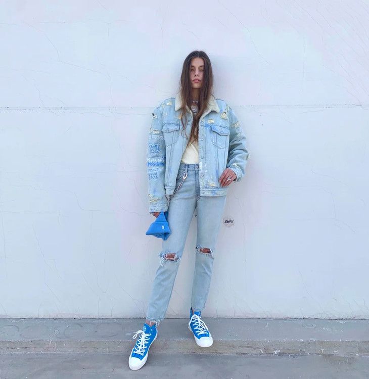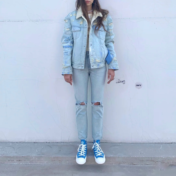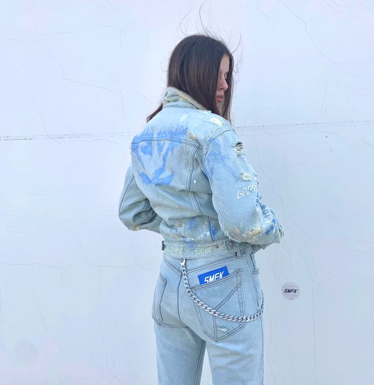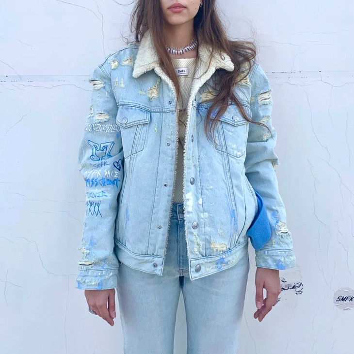 [流浪牛仔夹克] 牛仔蓝(手绘),版型选自2016年的第一代手绘牛仔夹克,手绘加入洞窟壁画,Double7,Not for sale 等经典元素。材质方面,SMFK开发的高品质混纺再生涤纶,在使用中我们可以感受到类似羊羔毛的柔软和保暖,雨雪过后不会影响材质风貌;在未来,我们将投入和应用更多环保节能的再生资源。工艺部分,从缝纫到水洗破坏打磨都由丰富牛仔制品经验的手工艺师傅操作完成,是SMFK五年来的佳作。
