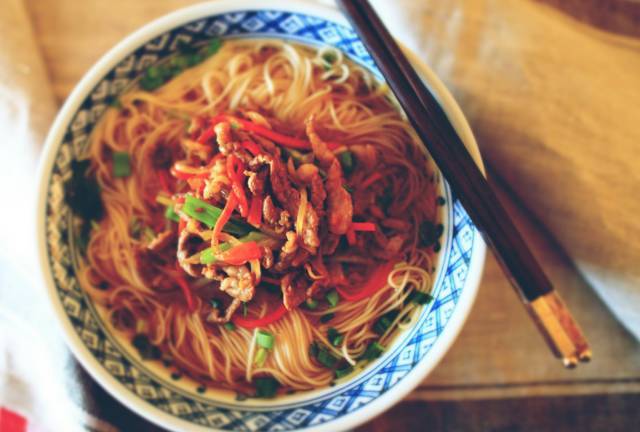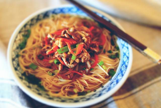 3、根据自己口味在肉汤锅中调入盐、白胡椒粉、陈醋等,直接浇在面里,就做好了。