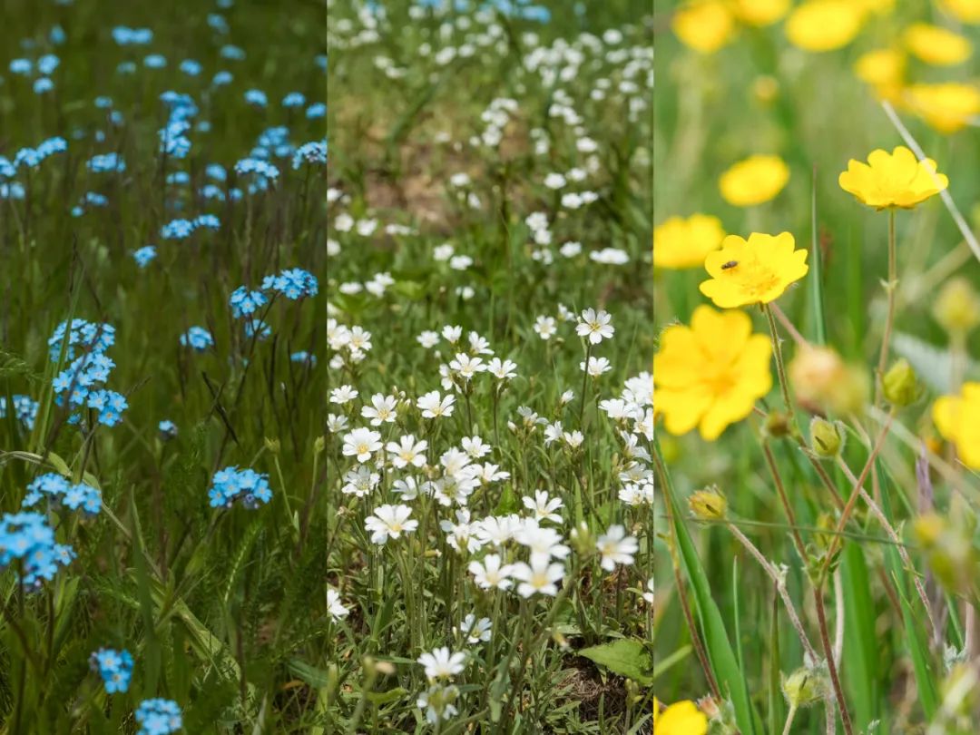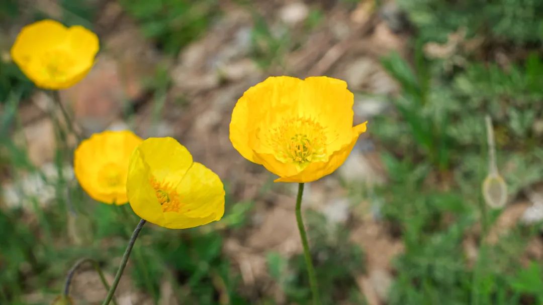 野罂粟花瘦弱的枝干随风摇曳,盛开的金色花朵明媚喜人,草地上匍匐生长着齐平的黄的、蓝的、白的......各色小野花,用绚丽的色彩点缀着这片土地。