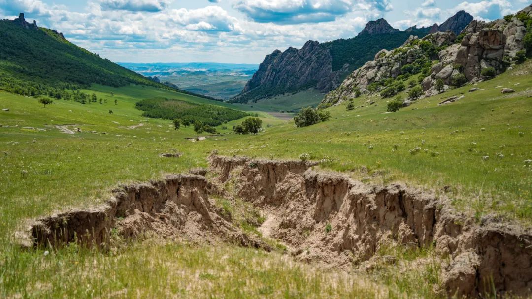 沿着碎石遍布的草甸向上爬,渐入山腰,这里有一道被自然之斧劈开的深沟大裂痕,仿佛地球的伤痕,壮观又凄美,被京郊徒步圈盛赞为“现实版塞尔达”“海拉鲁大陆”。