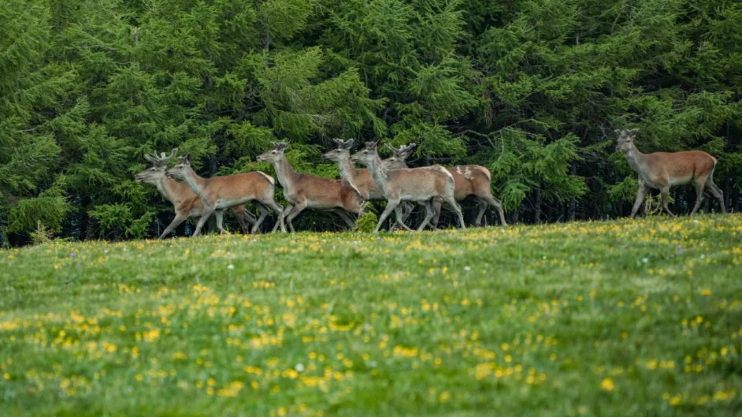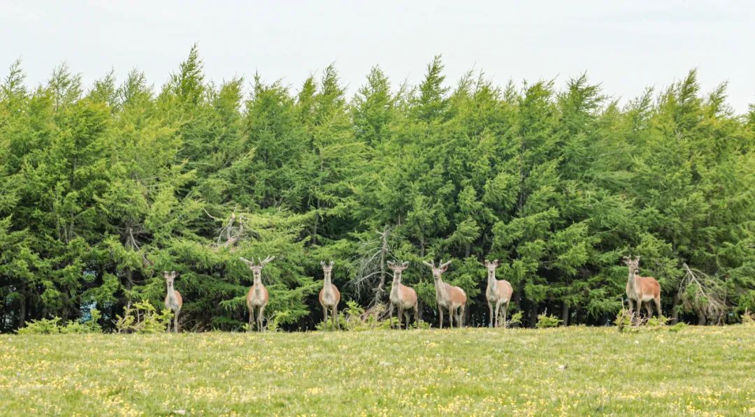 正沉浸在悠闲的吃播之时,远处的森林忽然跳出一群动物,身手十分矫健,定睛一看:竟然是野生鹿群!领跑的可不正是鹿王,头上巨大的鹿角赫然显示其权威地位!