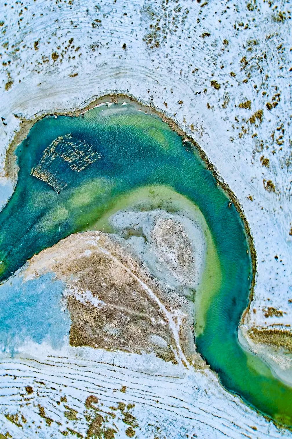 因盐度差异与湖底地貌,湖水呈现奇特的“半咸半淡” 双色景观——东部深蓝如海(主湖区),西部浅湾泛绿(岗更诺尔)。晴日下,200 平方公里湖面,如巨幅琉璃镶嵌在青翠的草原中。