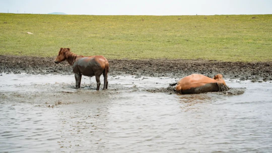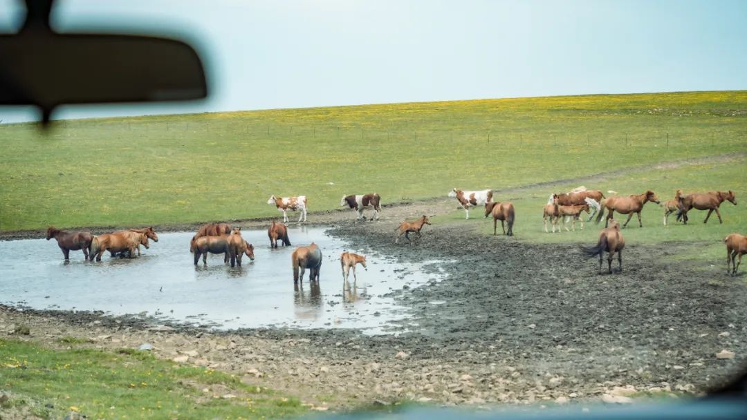 有意思的是,我们路遇一个小泥潭,牛群马群正肆意地在泥潭中打滚儿,一个骨碌就 360 度滚上一圈儿,司机王大哥笑称这不正是“天马浴河”,倒是活泼极了!
