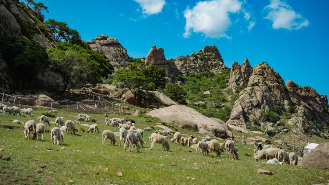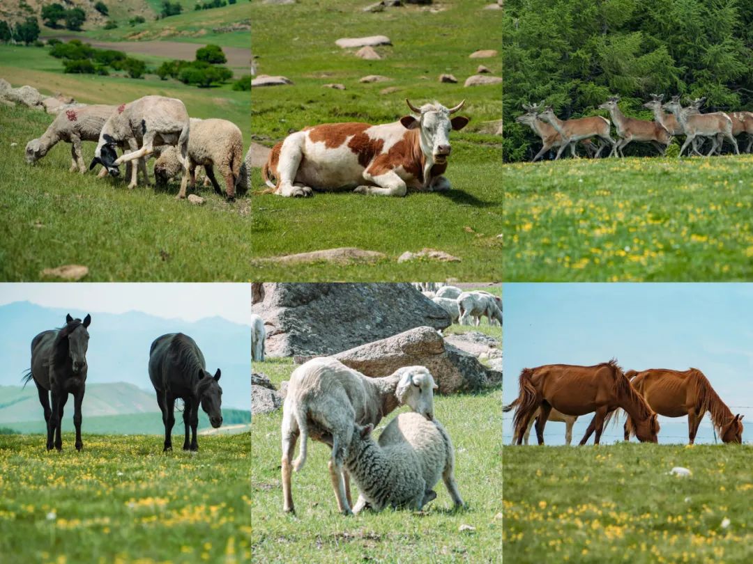 穿越连绵的山脊,一片开阔的牧场映入眼帘。成群的牛羊悠然自得地散布在草地上,三五成群,或悠闲地漫步,或低头啃食着鲜嫩的青草,或抬头张望,或干脆趴在草地上小憩,模样可爱极了。