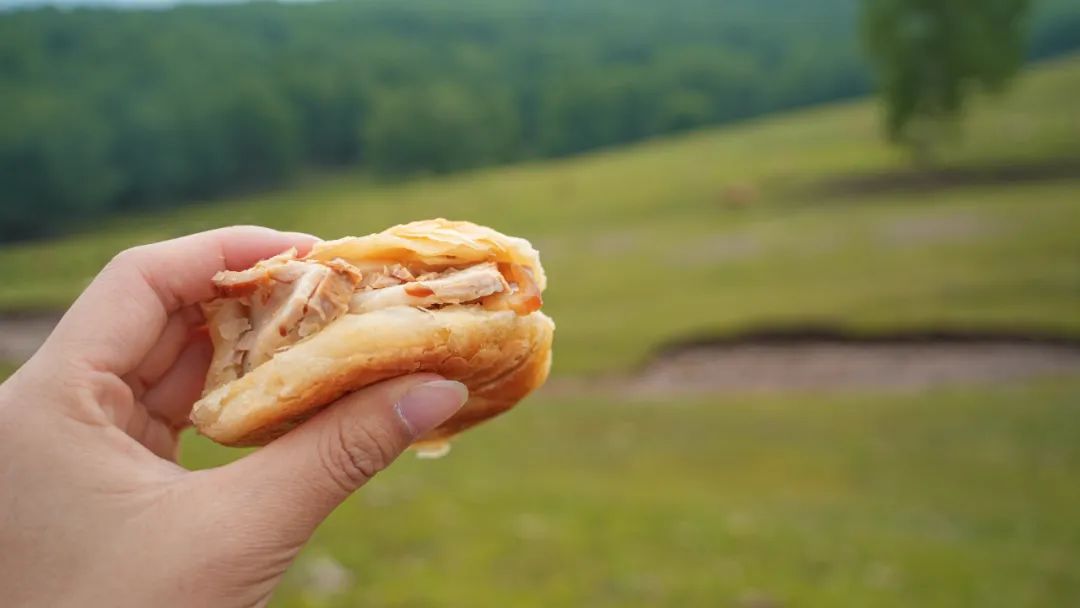 我们顺势在草地坐下,拿出早上准备好的豪华路餐——赤峰特色美食对夹,烧饼里夹熏肉,别称是中国汉堡,不得不说确实香酥可口。🍔