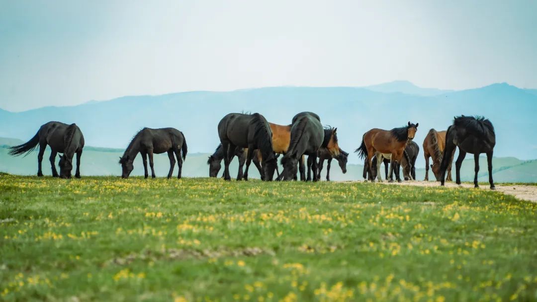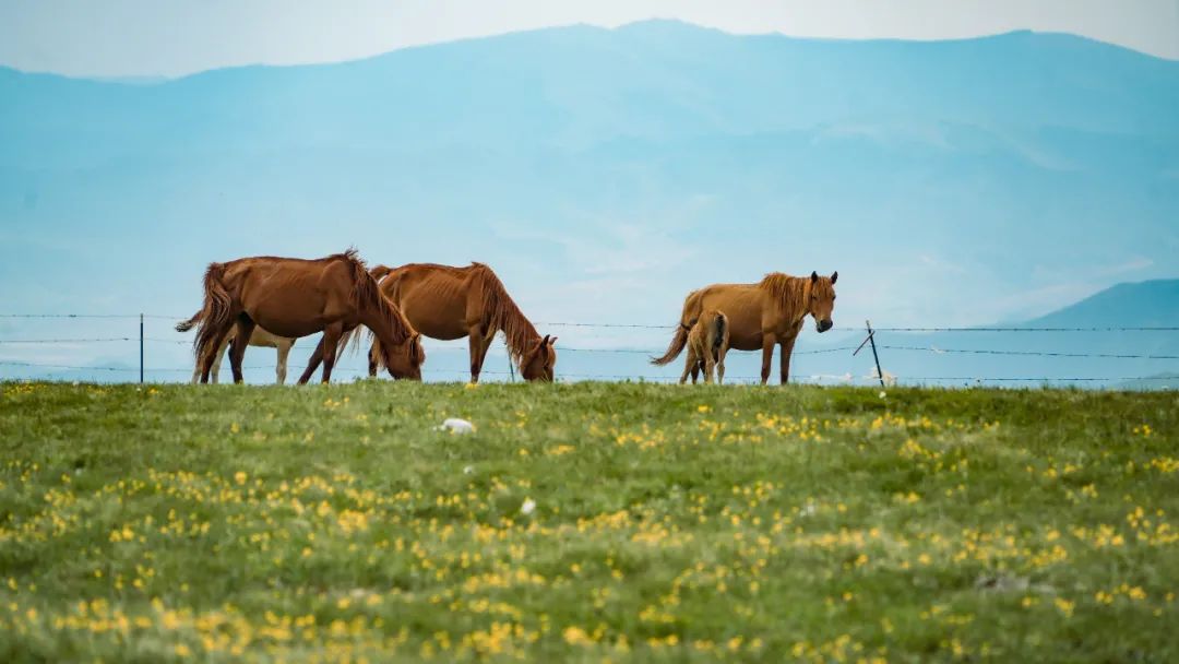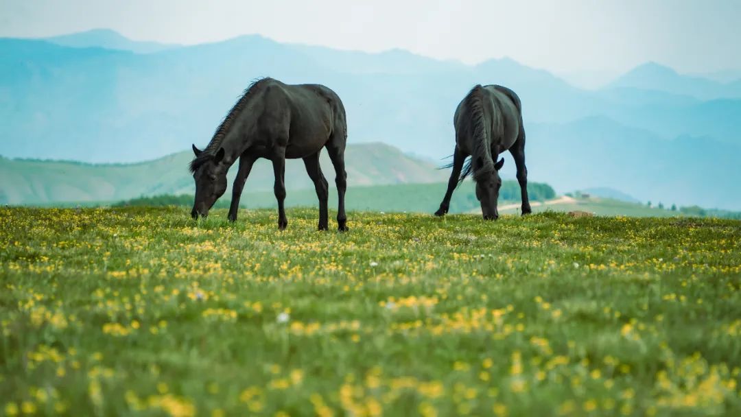 黑马英俊干练,棕马温柔憨厚,随着马儿们一步步逼近,我正在琢磨“它们莫不是要围攻我吧”的时候,马儿们原地开启了干饭模式,草原吃播原地上线。让我得以近距离欣赏马儿们的健美,并狂摁不下一百张骏马写真~